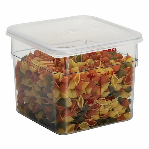 CamSquare Food Container, 6 qt., 8-3/8”L x 8-3/8”W x 7-1/4”H, red graduation, polycarbonate, dishwasher safe, resists stains & odors, clear, NSF, Made in USA