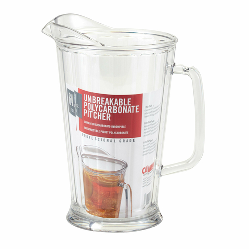 Camwear Pitcher, 64 oz., 7-5/16” dia. x 9-1/4”H, chip & break resistant, thumb-grip pour, contoured lip & pour spout, dishwasher safe, slotted base, polycarbonate, clear, NSF, Made in USA