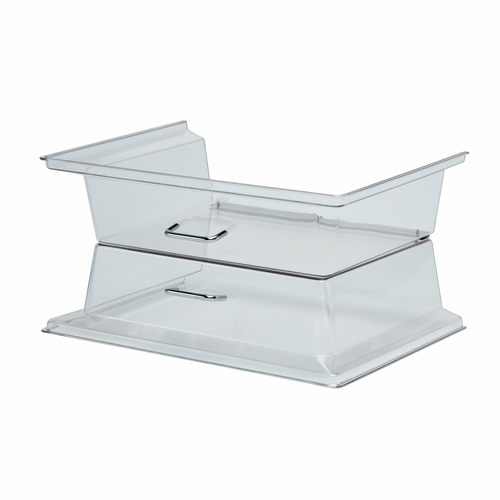 Camwear Display Cover, 26-3/4”W x 18-3/4”D x 5-1/8”H, fits 18” x 26” tray, rectangular, with hinge, chrome handles are attached, polycarbonate, clear, Made in USA