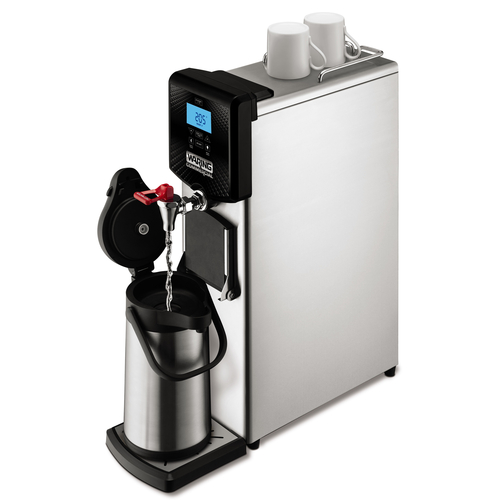 Hot Water Dispenser, countertop, electric, 5 gallon capacity, 150F – 205 temperature range, digital controls, LCD display, night-mode feature, Tomlinson No-Drip tap, fold-down shelf for cup fill, guard rails on warming surface, removable bottom drip tray, stainless steel construction, 120v/60/1-ph, 1.44 kW, cord and NEMA 5-15P, NSF, cETLus