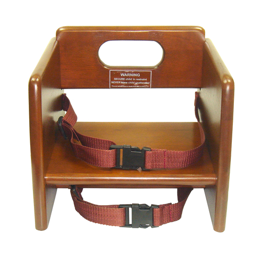 Booster Seat, stacking, 11-3/4”L x 11-3/4”W x 10-1/2”H, waist and chair straps, rubberwood, walnut finish, ASTM compliant (Qty Break = 2 each)