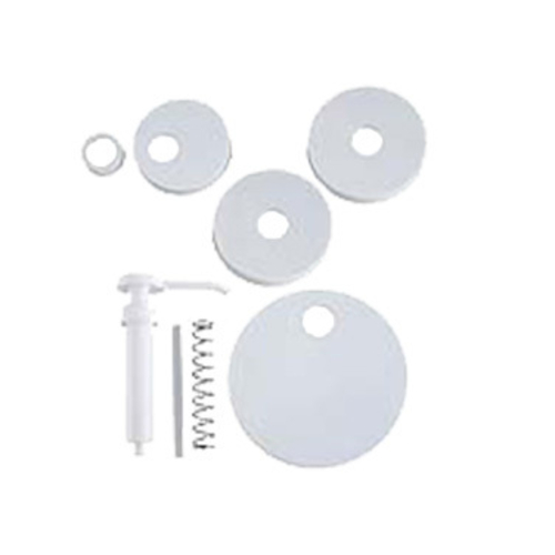 Pump Kit, includes: (1) 9” standard pump, (5) lids: 1-9/16” threaded, 3-11/16” threaded, 4-1/2” threaded, 4-1/2” snap on, & 6-5/16” snap on, plastic, white (Qty Break = 12 set)